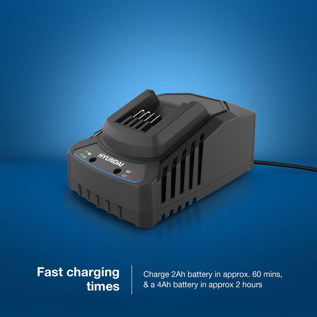 The Hyundai C20-2 is a 20V lithium-ion battery charger designed specifically for charging batteries in the Hyundai 2nd Generation 20V cordless garden machinery and power tool range.