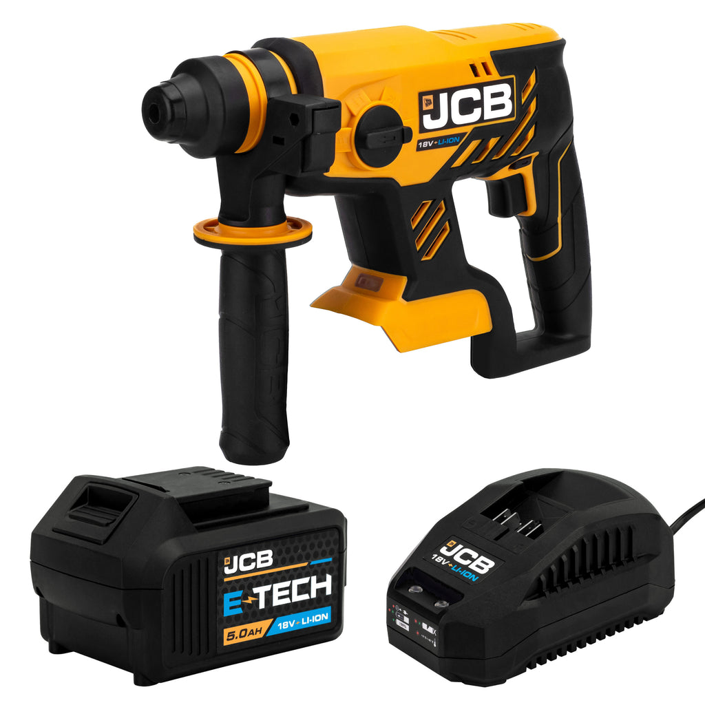 - This JCB 18V 1.7J Brushless SDS Hammer Drill kit includes 4 SDS bits, SDS Plus and keyless chucks, a 5.0Ah lithium-ion battery with 2.4Ah fast charger.