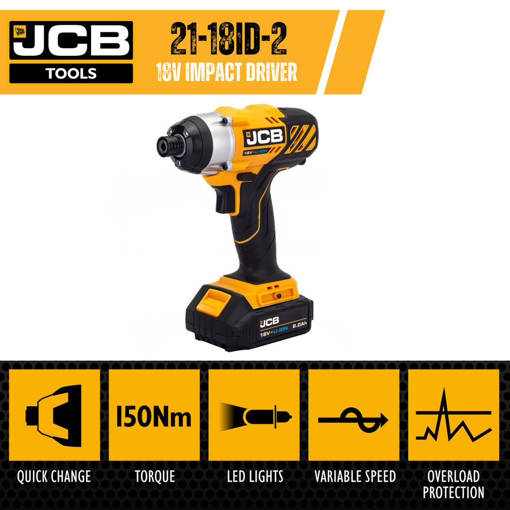 In The Box | 1x JCB 18V Impact driver, 1x JCB 18V 2.0Ah Lithium-ion battery, 1x JCB 18V 2.4A Fast Charger, Belt clip |